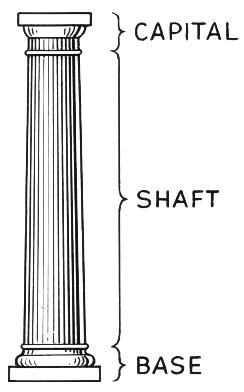 • An upright vertical member which usually stands clear of the main body of a building. A column rests on a base and is crowned by a capital.
