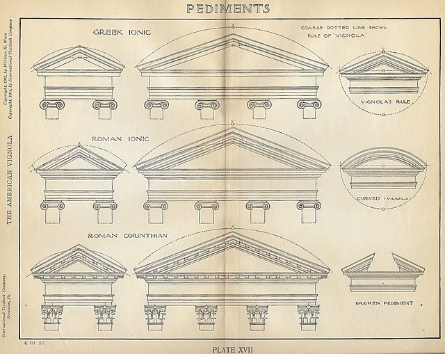 • Triangular shaped portion of a wall placed above the horizontal structure of the lintel, or entablature, if supported by columns.